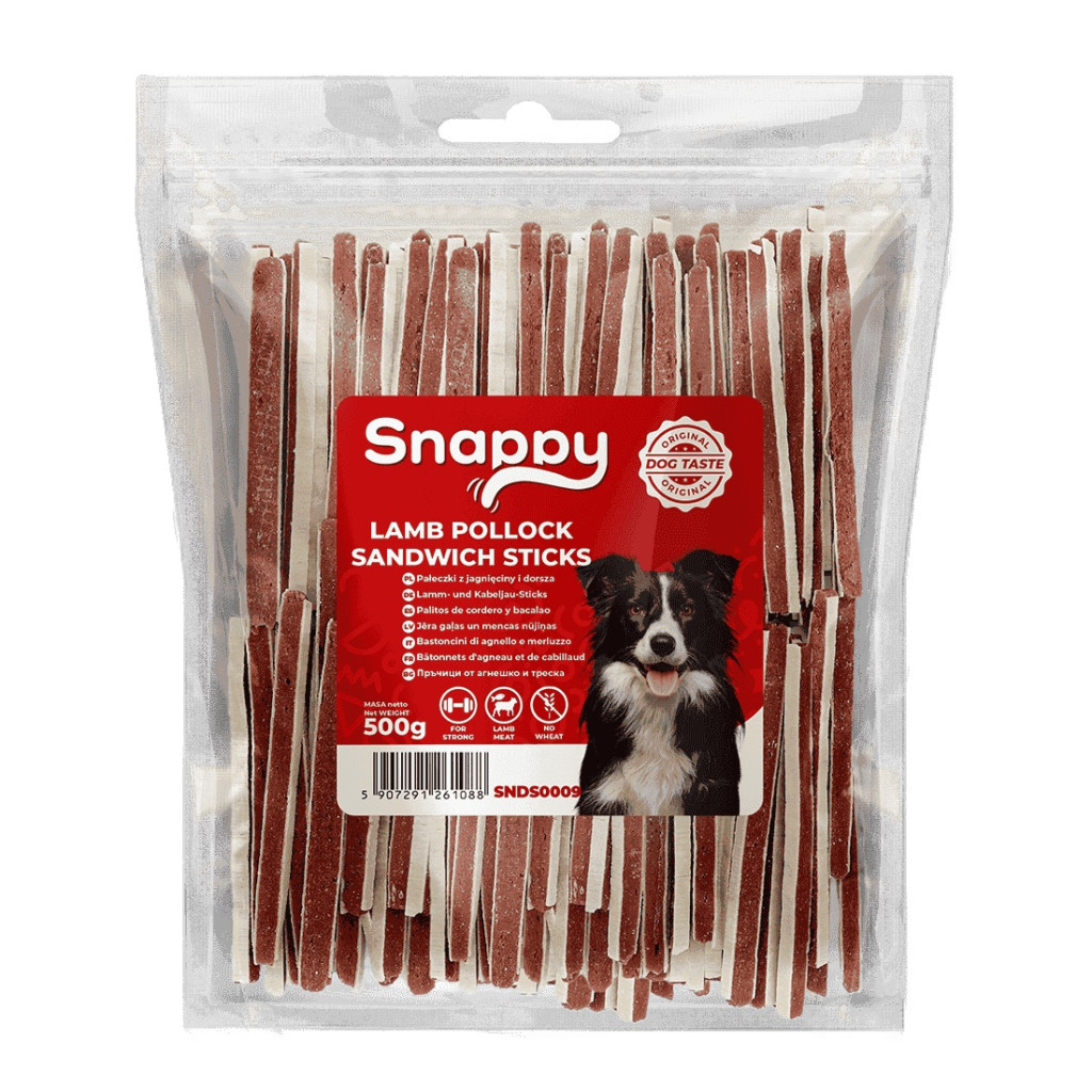 Kényeztesse kedvencét a Snappy Dog Snacks Pawsticks prémium szendvicsrudacskákkal, amelyek az ízletes bárányhús és a tápláló tőkehal különleges kombinációját kínálják. Ez a gazdaságos, 500 grammos kiszerelés ideális választás tréningezéshez vagy napi jutalmazáshoz, miközben értékes fehérjeforrást biztosít kutyája számára. A visszazárható csomagolás garantálja a hosszan tartó frissességet és az ellenállhatatlan aromát minden falatnál.