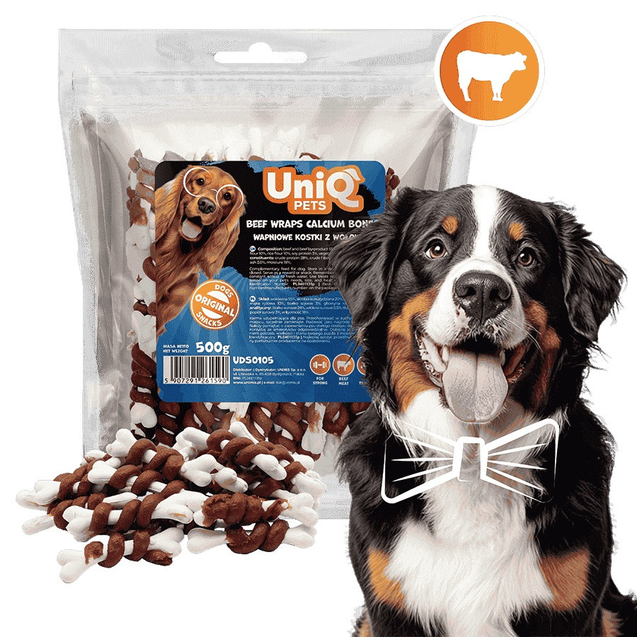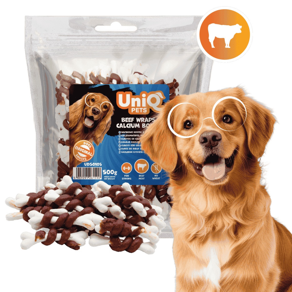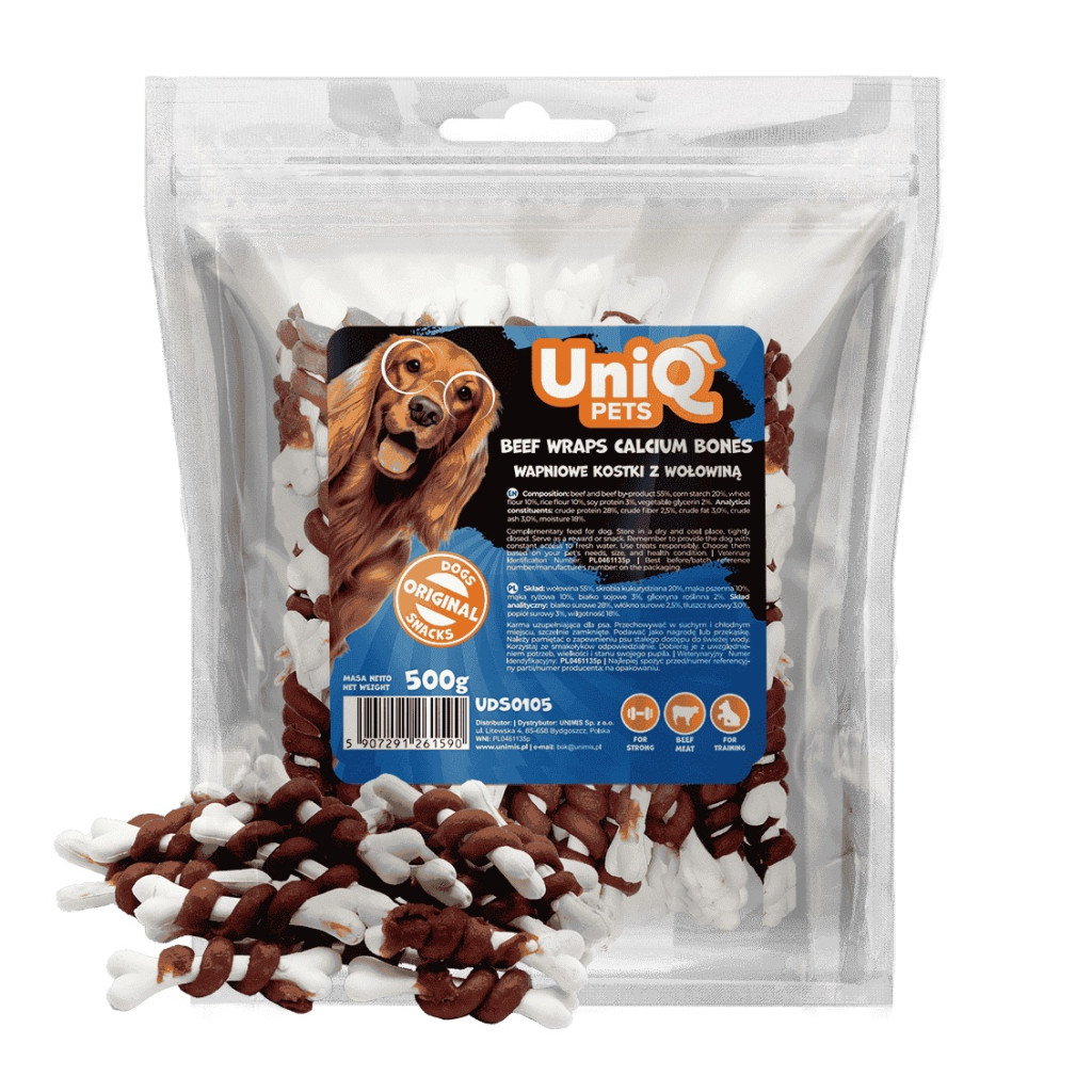 Miért válassza ismét az UNIQ PETS DOG SNACKS CHEWY 500g marhahúsos, kalciumos csontcsomagolású KUTYASNAKÁINKAT?