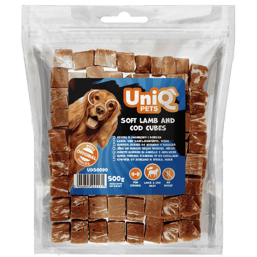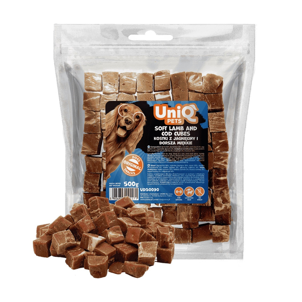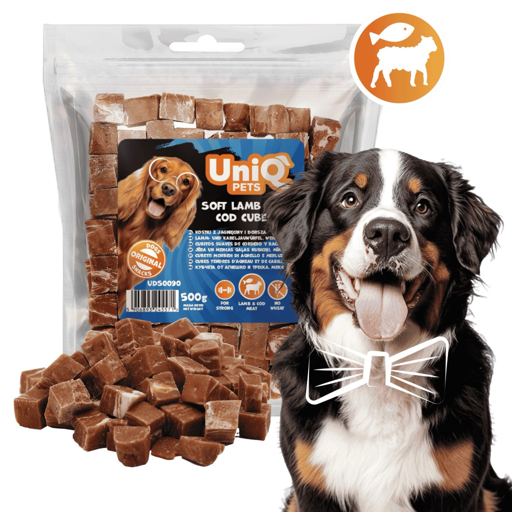 UNIQ PETS DOG SNACKS CHEWY – Puha bárányos és tőkehalas jutalomfalat kockák kutyáknak, 500g