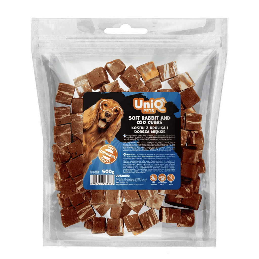 UNIQ PETS DOG SNACKS CHEWY – Puha rágós falatok kutyáknak – Nyulas és tőkehalas kockák 500g