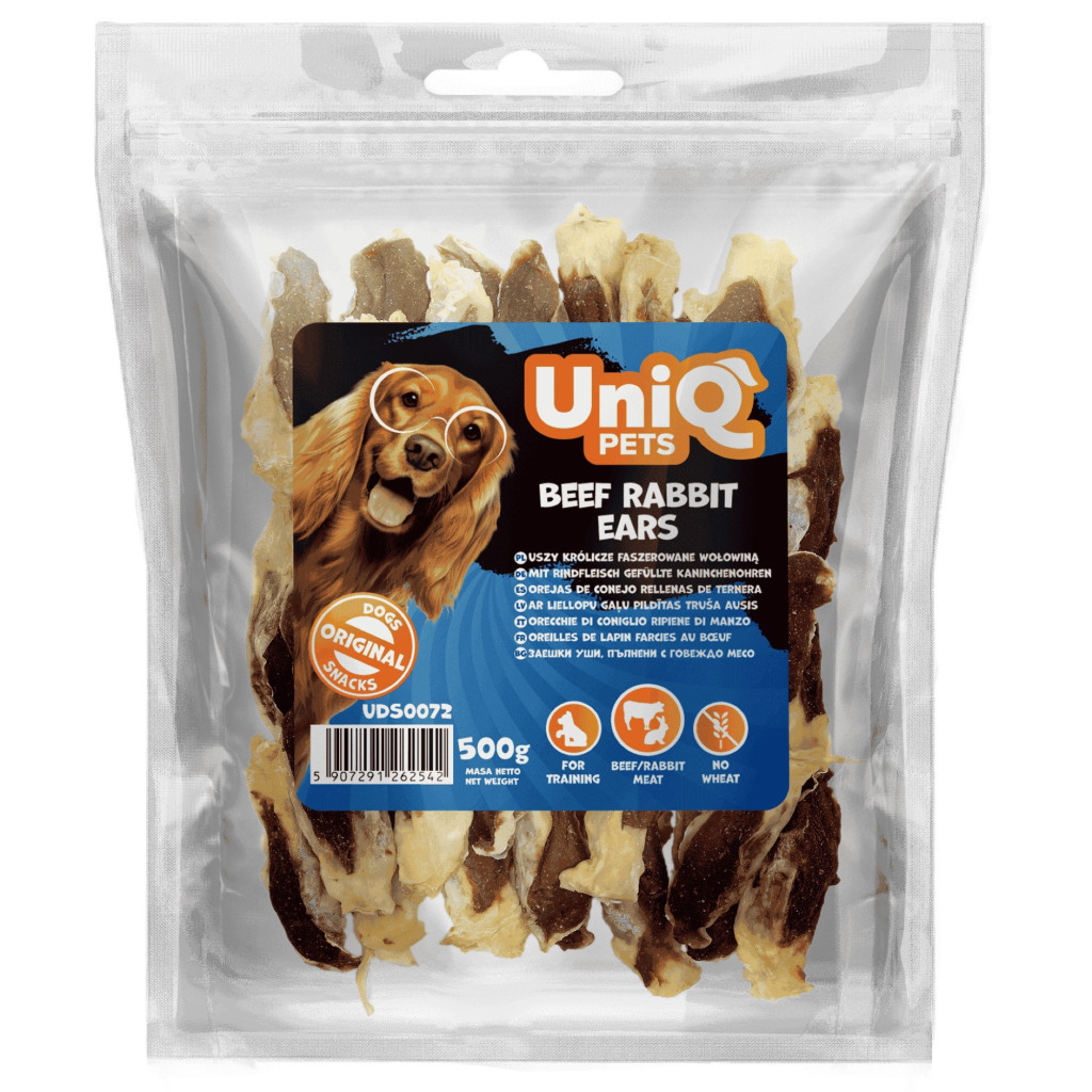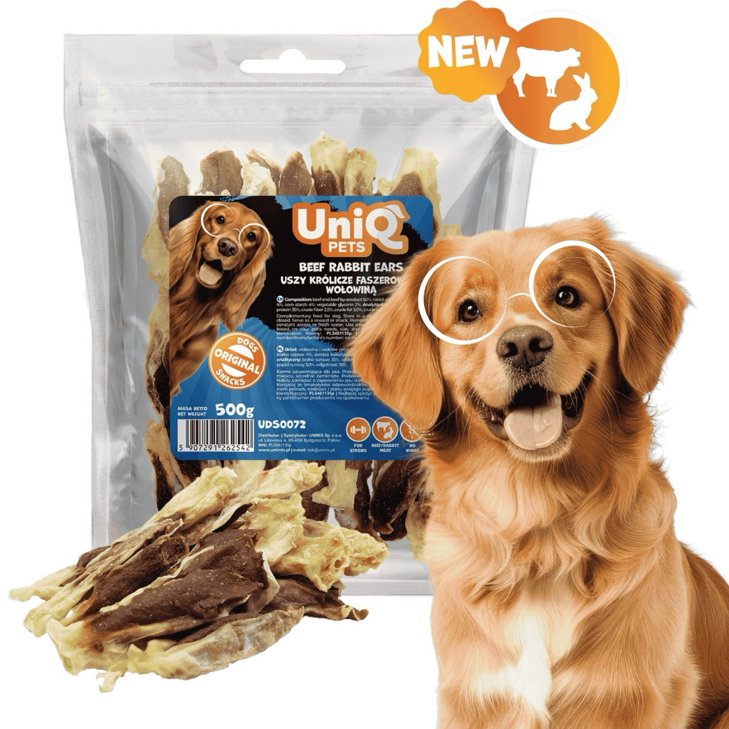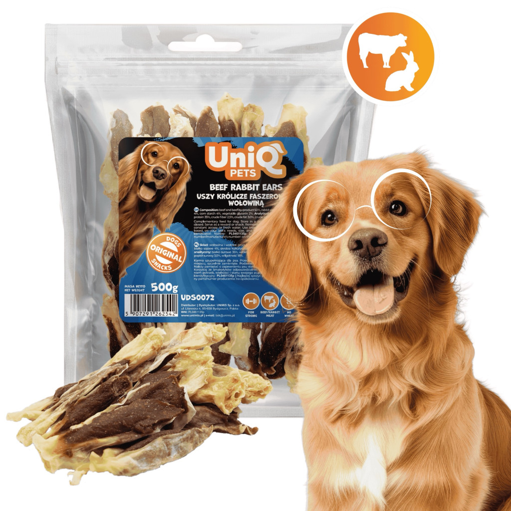 UNIQ PETS DOG SNACKS MEATY – Húsos jutalomfalat kutyáknak – marha és nyúlfül, 500g