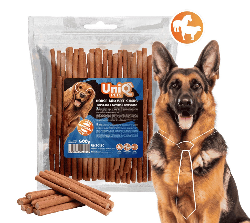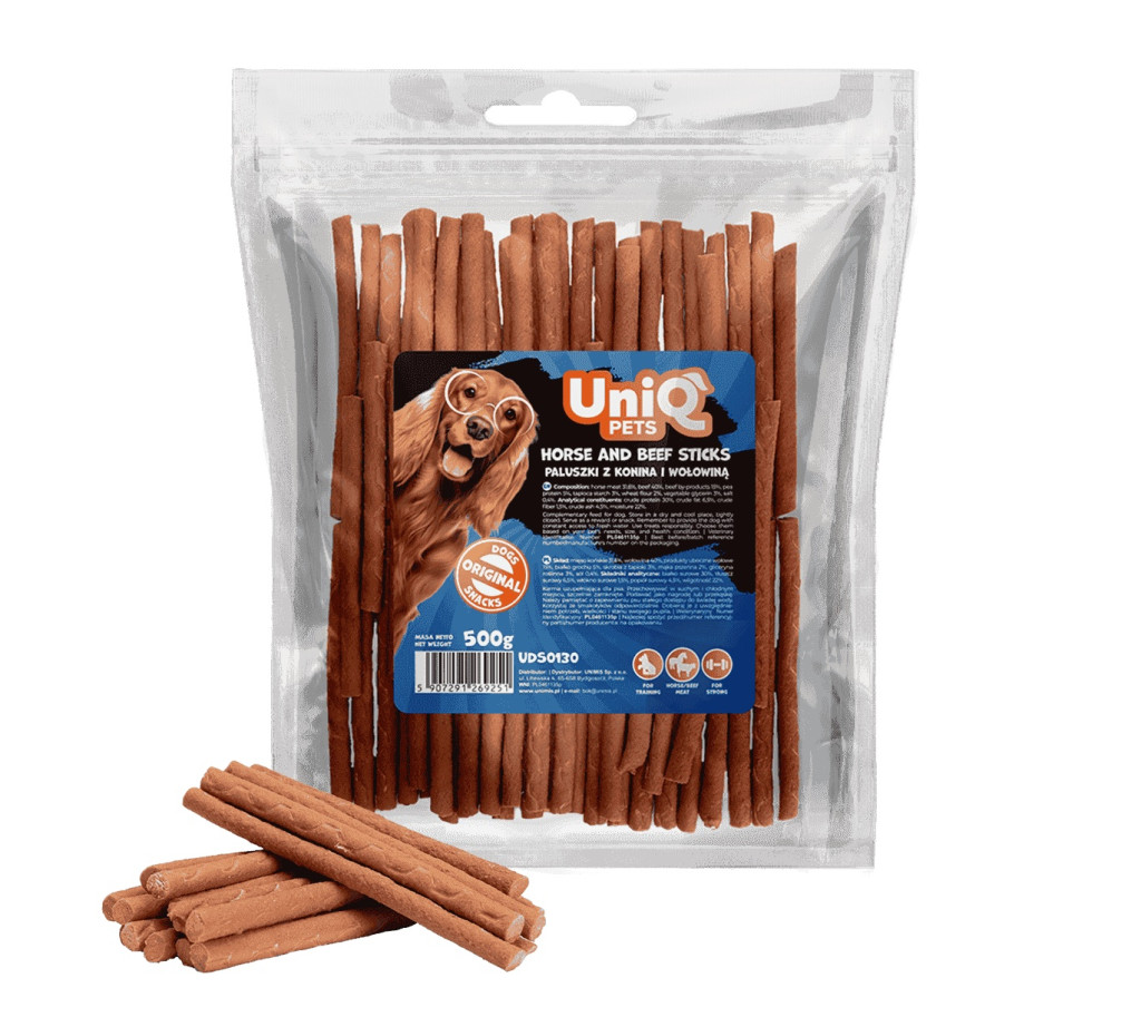 UNIQ PETS DOG SNACKS MEATY – Lóhúsos és marhahúsos jutalomfalat rudacskák kutyáknak, 500g