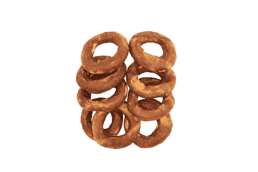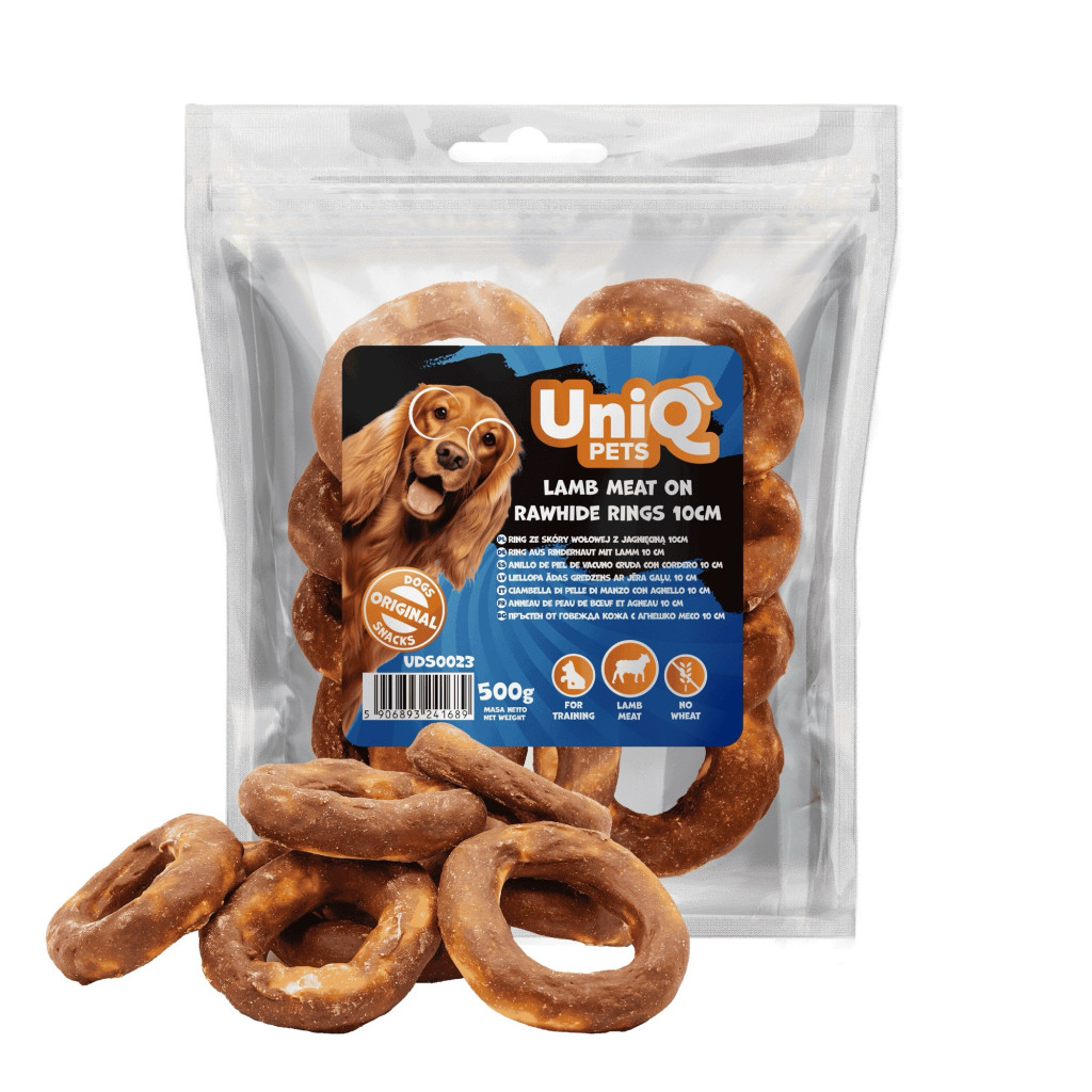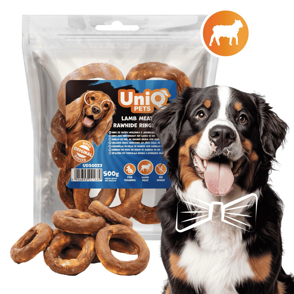 UNIQ PETS DOG SNACKS RAWHIDE – Bárányhúsos rágókarika bivalybőrrel (10 cm) 500g
