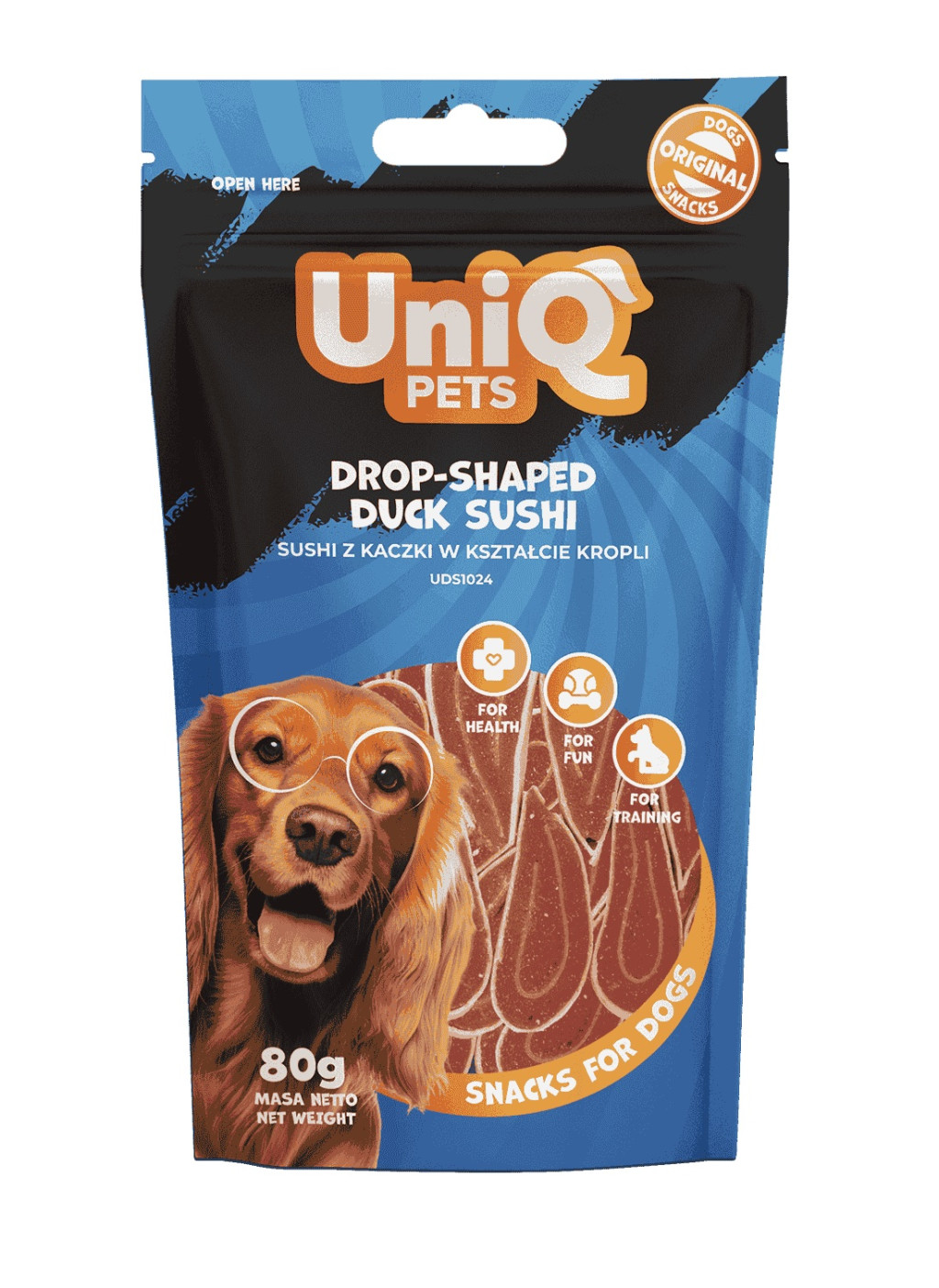 UNIQ PETS DOG SNACKS WAGGI – kutyacsemege – csepp alakú kacsás sushi, 80g